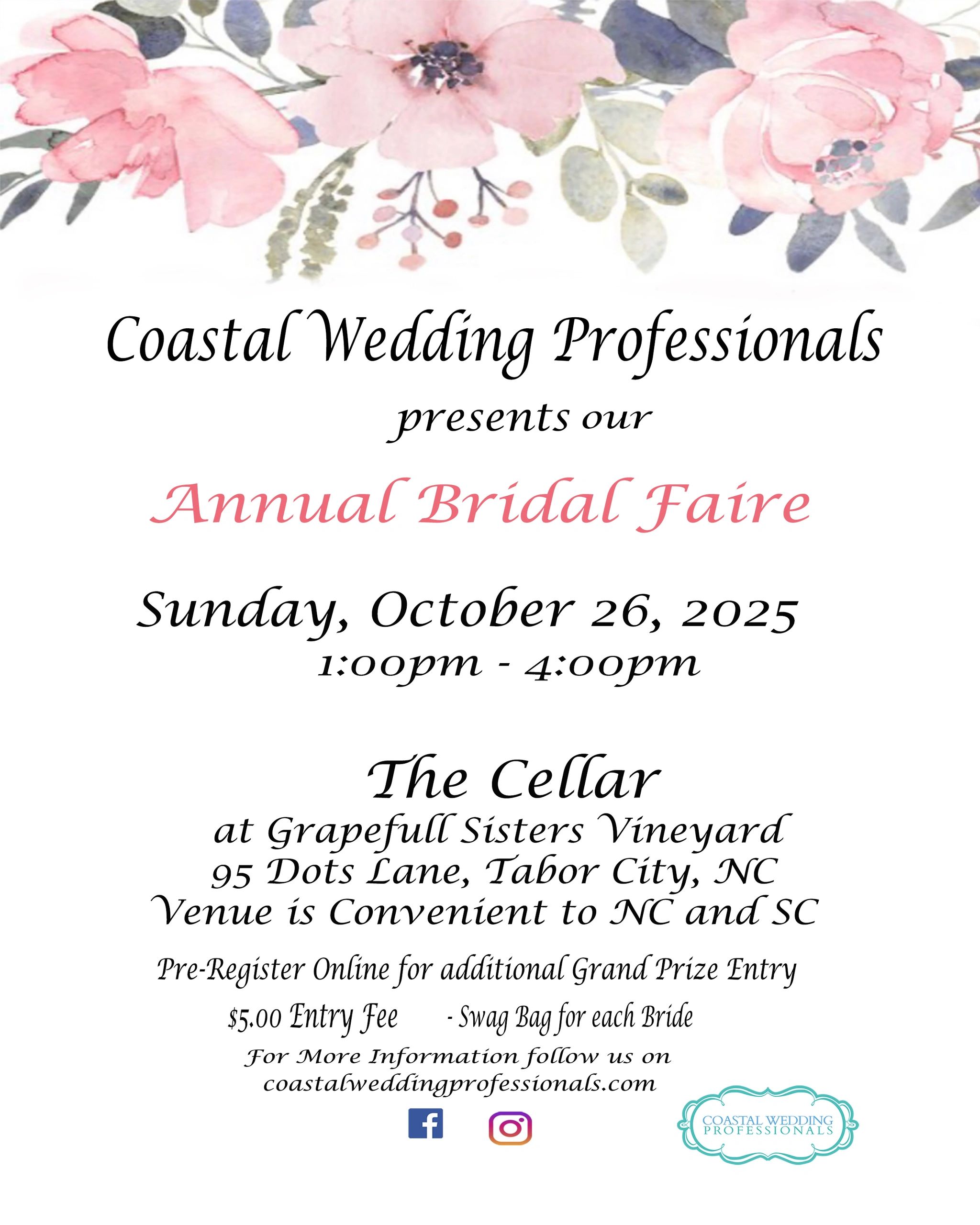 Plan to attend our Annual Bridal Faire, meet Wedding Professionals for all your wedding needs, enjoy all that the CWP Members have to offer with great food, great drink & so much more!